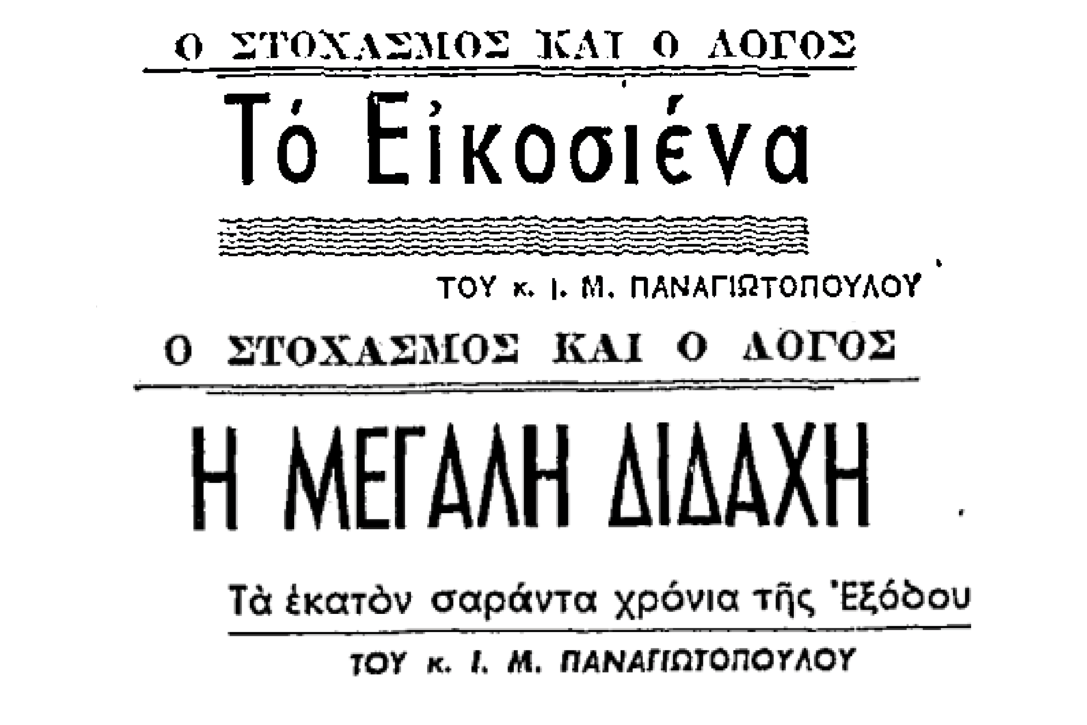 Η στήλη του στην Ελευθερία τιτλοφορείτο «Ο στοχασμός και ο λόγος» και το πρώτο άρθρο του σ’ αυτήν, «Το Εικοσιένα», δημοσιεύτηκε πριν 70 χρόνια, την Κυριακή 25/3/1956. Δέκα χρόνια αργότερα, στις 3/4/1966, με αφορμή τη συμπλήρωση 140 χρόνων από την Έξοδο του Μεσολογγίου, ο Ι.Μ.Παναγιωτόπουλος αφιέρωσε στο Μεσολόγγι την τακτική κυριακάτικη επιφυλλίδα του, με τίτλο «Η Μεγάλη Διδαχή». Φέτος, 60 χρόνια μετά τη δημοσίευση της επιφυλλίδας αυτής, γιορτάζουμε τη συμπλήρωση 200 χρόνων από την Έξοδο του Μεσολογγίου.