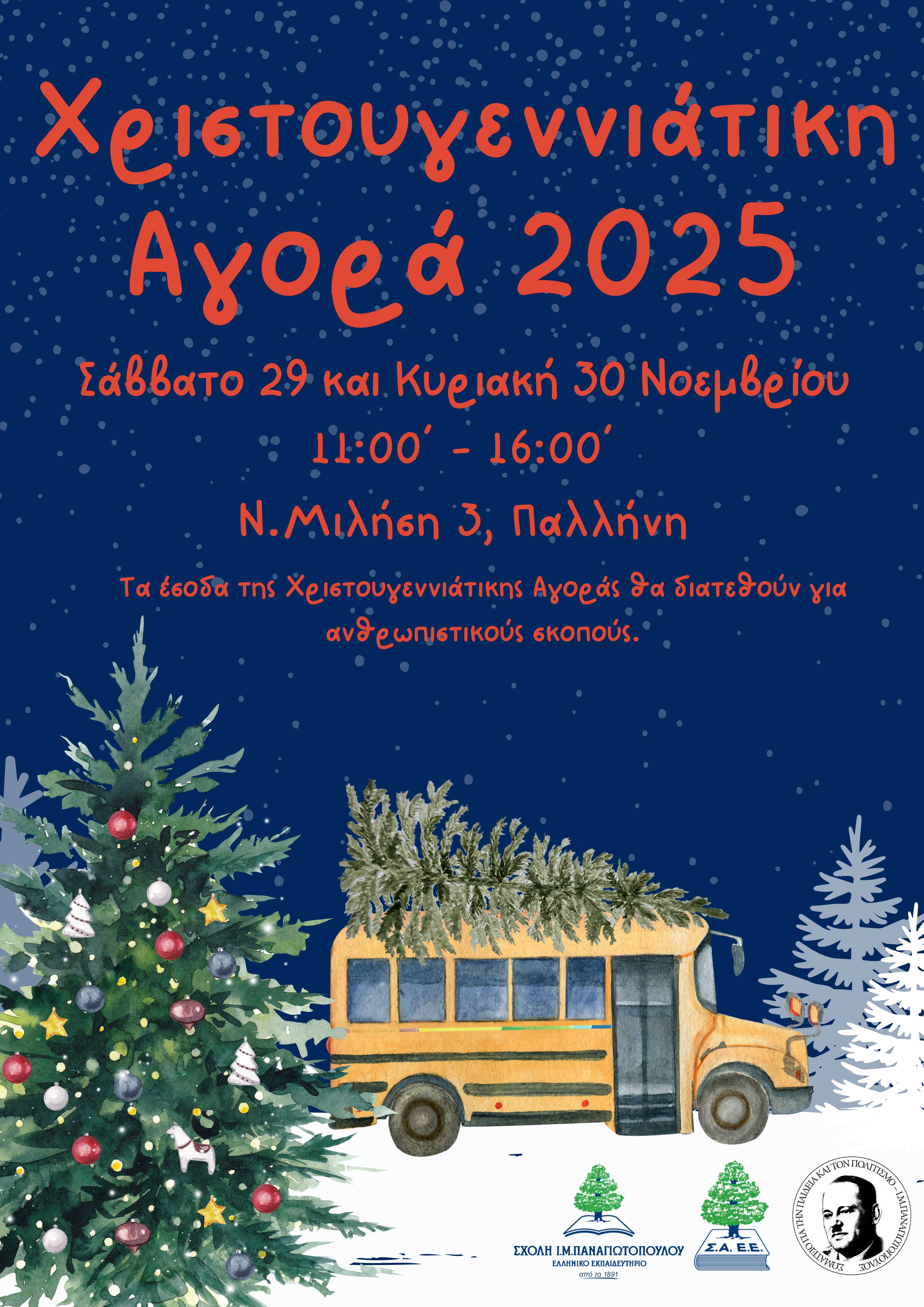 Το Σωματείο για την Παιδεία και τον Πολιτισμό-Ι.Μ.Παναγιωτόπουλος, οι μαθητικές κοινότητες όλων των βαθμίδων και ο Σύλλογος Αποφοίτων Σχολής Ι.Μ.Παναγιωτόπουλου, σας προσκαλούν με χαρά στη 32η Χριστουγεννιάτικη Αγορά, το Σάββατο 29 και την Κυριακή 30 Νοεμβρίου 2025!